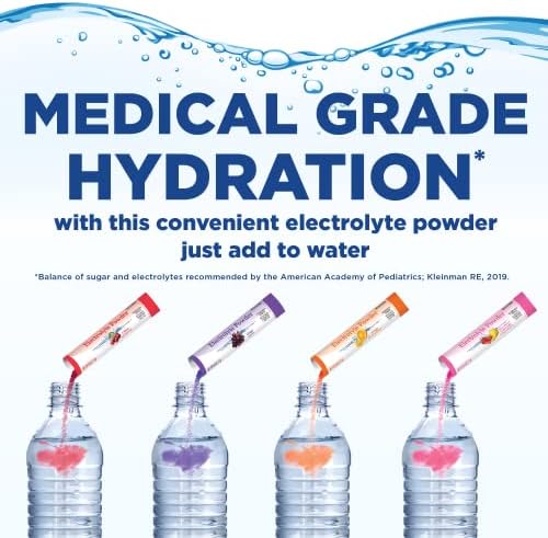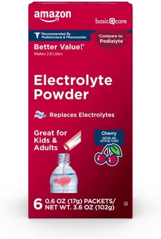 Compare to Pedialyte. Amazon Basic Care Electrolyte Powder quickly and effectively restore fluids and electrolytes lost in mild to moderate dehydration. Electrolyte powder drink mix packets are easy to bring along wherever life takes you. Mix with 16 fl oz water for a fast, effective rehydration liquid. It’s an easy way to turn your water bottle into a great tasting electrolyte drink. Cherry natural and artificial flavor. Great for adults as well as kids to help fight dehydration due to such common causes as intense exercise, heat exhaustion, travel, vomiting and diarrhea. With more electrolyte sodium than leading sports drinks, soda, juice and even water. Recommended by pediatricians and pharmacists. Six 0.6 oz (17g) packets makes 2.8 liters of electrolyte drink. This product is not manufactured or distributed by the owner of the registered trademark Pedialyte.